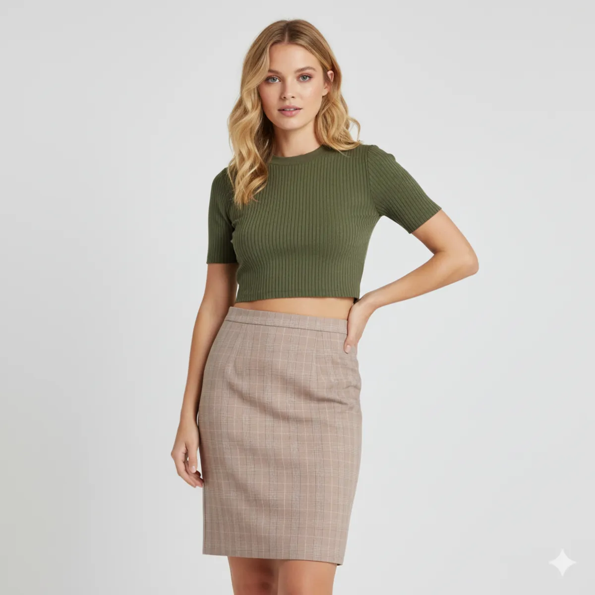 این دامن، یک دامن مدادی (Pencil Skirt) با قد تا بالای زانو است که شکلی راست و نسبتاً تنگ دارد و به زیبایی اندام را دنبال میکند.