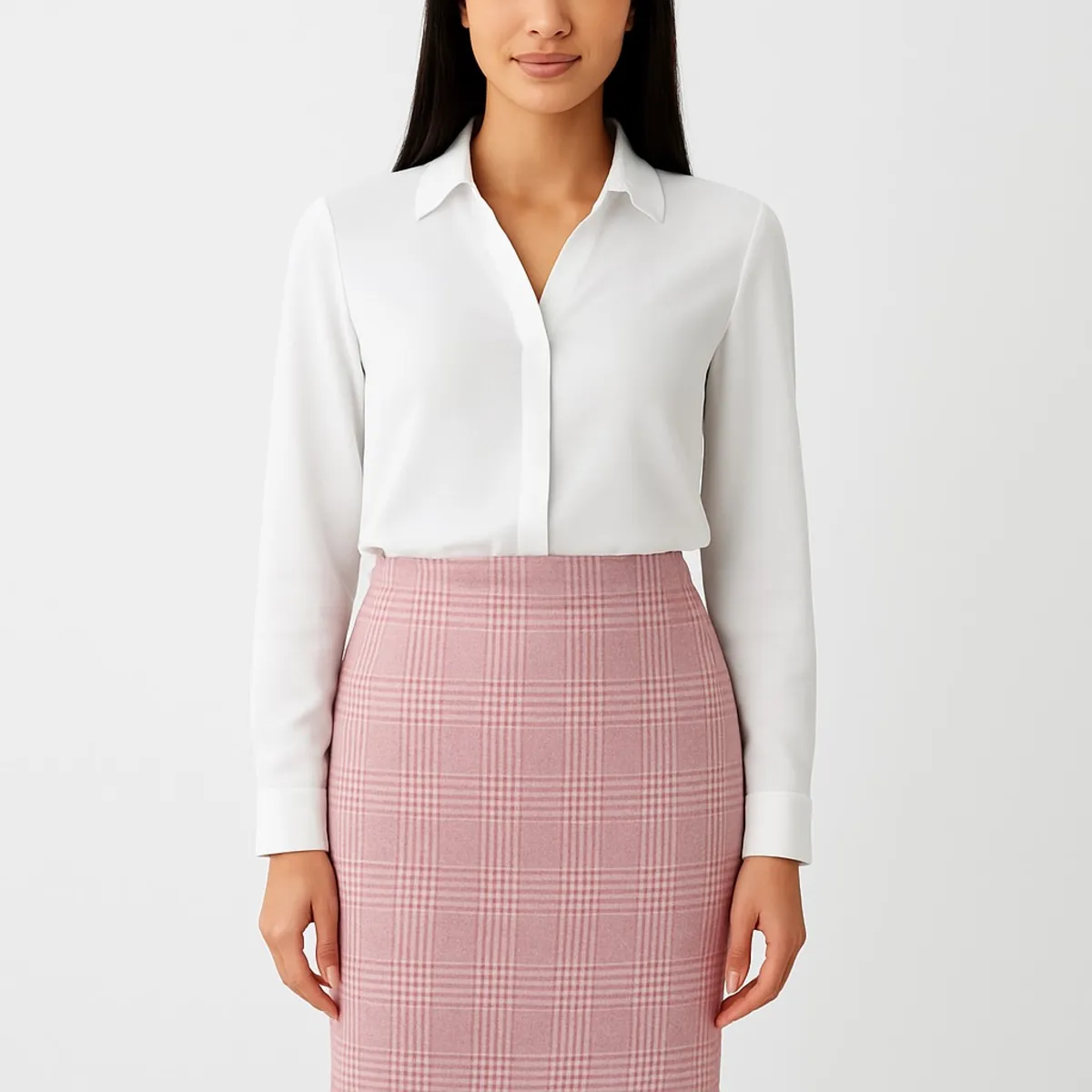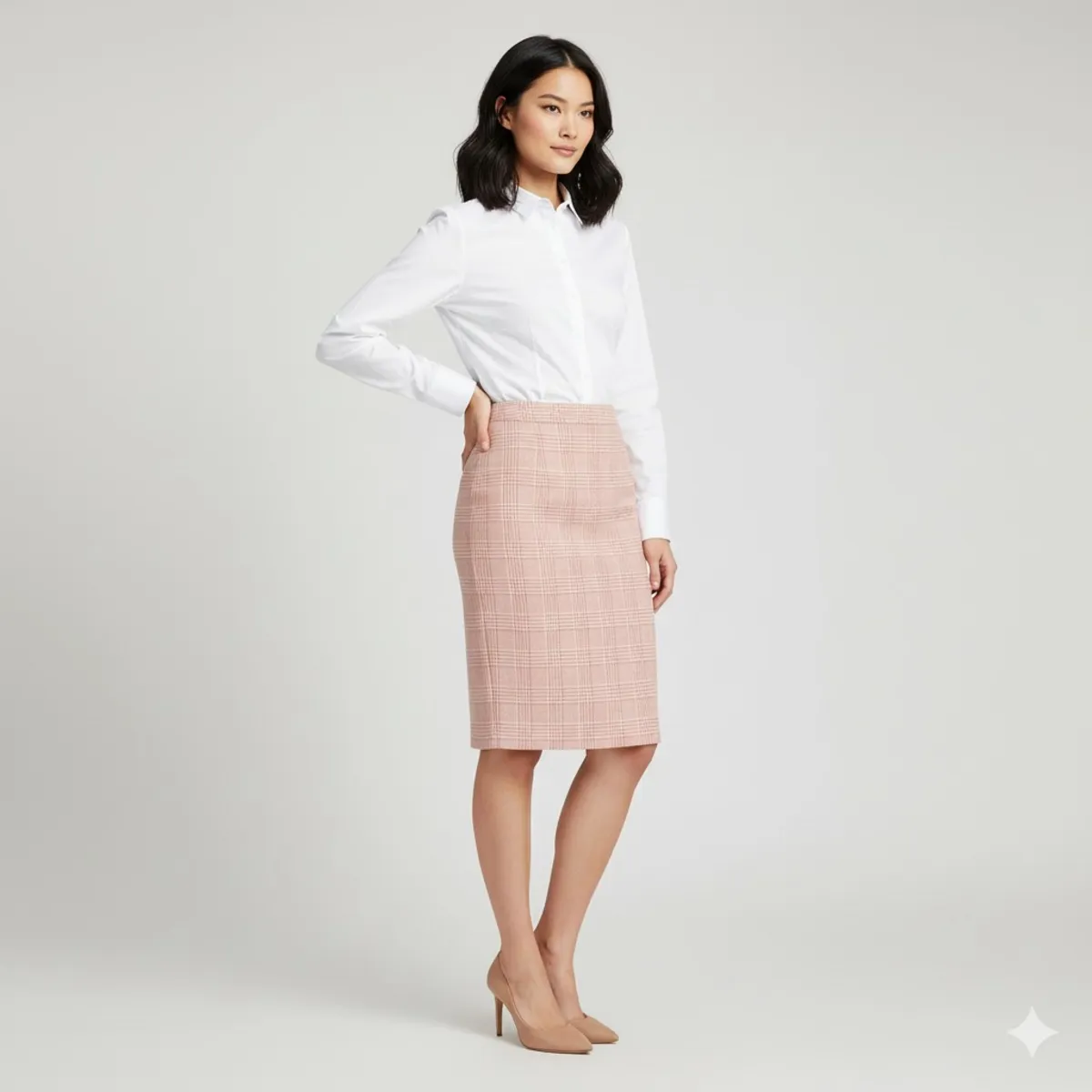 استایل: یک دامن رسمی و اداری (Business/Formal) که برای محیط کار یا مناسبتهای رسمی مناسب است، به ویژه وقتی با یک شومیز سفید ساده ست میشود.